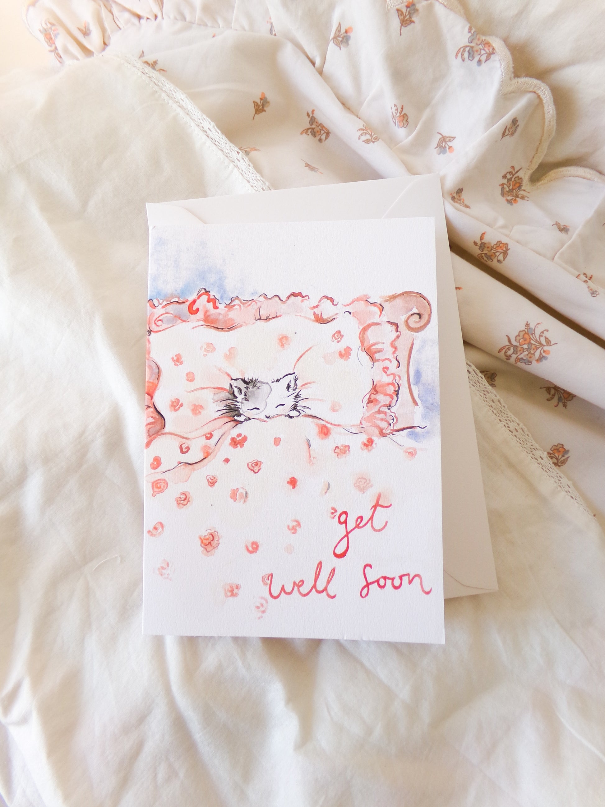 Beautiful kitten in bed (an interpretation of our daughter, when poorly), with "get well soon" hand written in watercolour. Let a poorly friend or family member know that you wish them well with this gorgeous illustration.