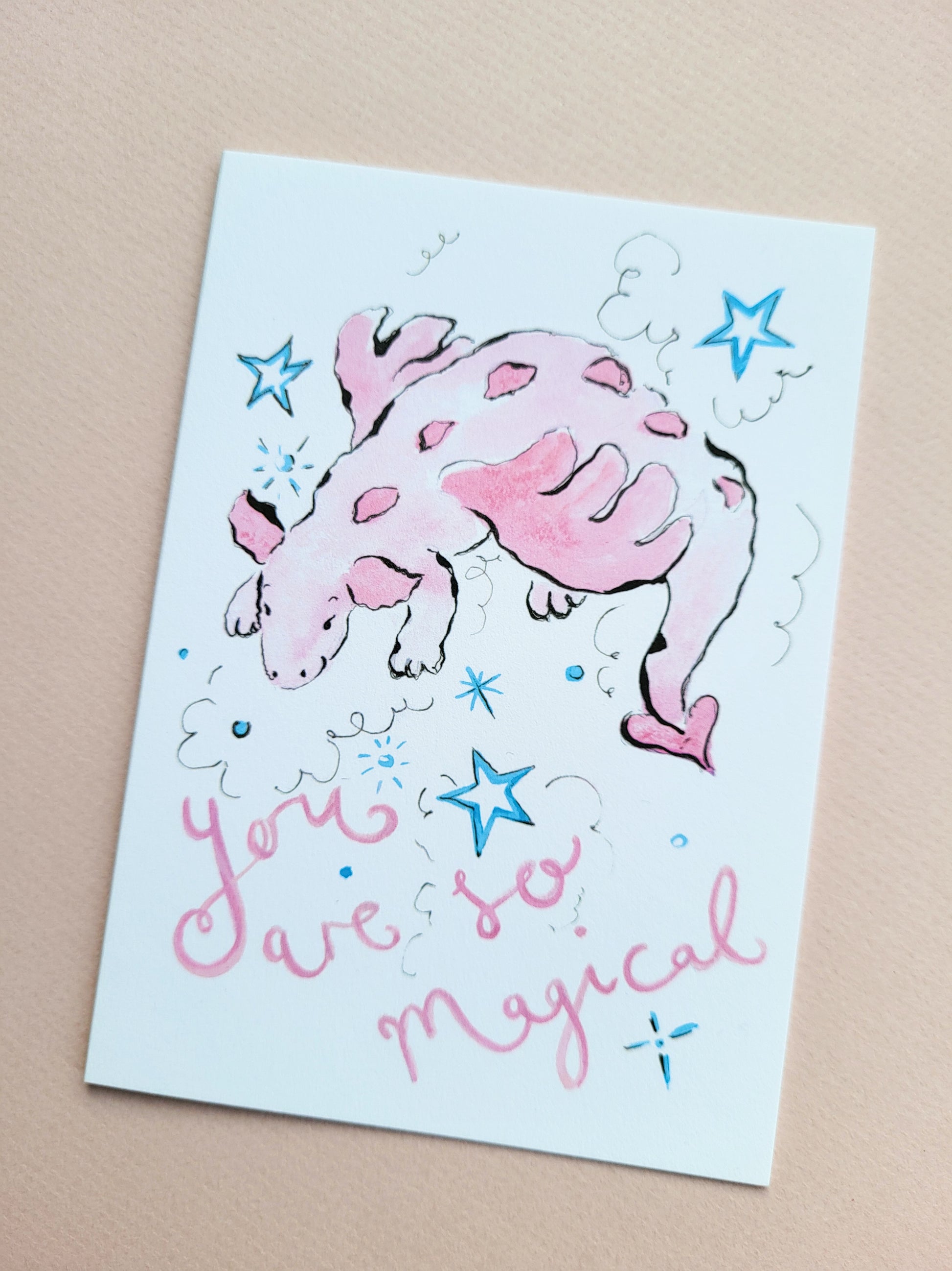 A whimsical, original greeting card that features a soft dragon flying in the sky and the wording "you are so magical".